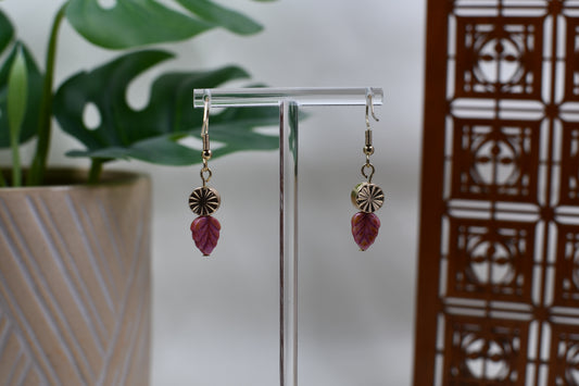 Gold Medallion Dangle Earrings with Red Leaf Charm