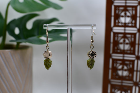 Gold Medallion Dangle Earrings with Green Leaf Charm