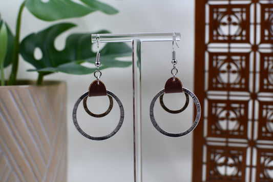 Gold and Silver Ring Dangle Earrings with Leather Accent