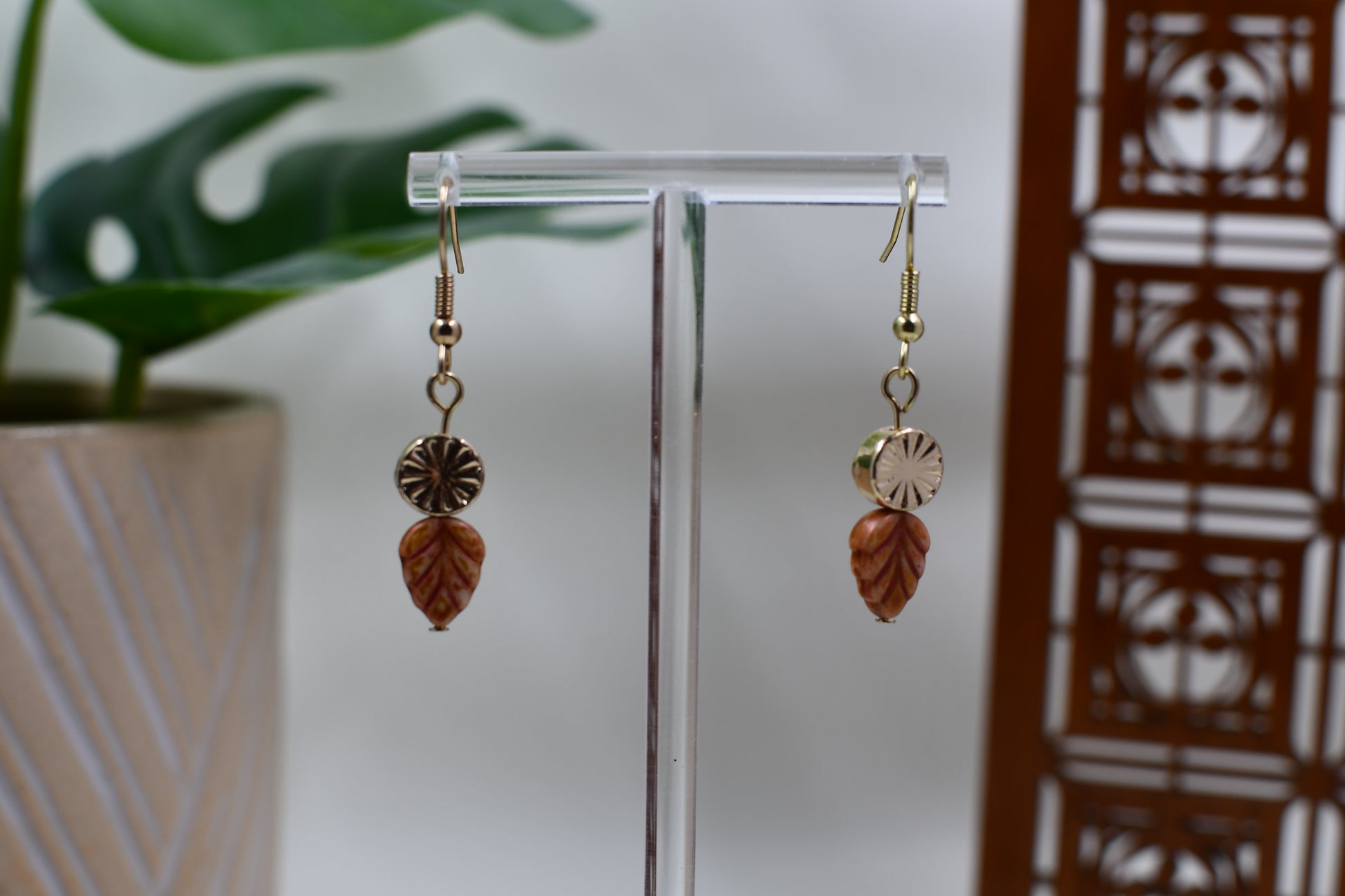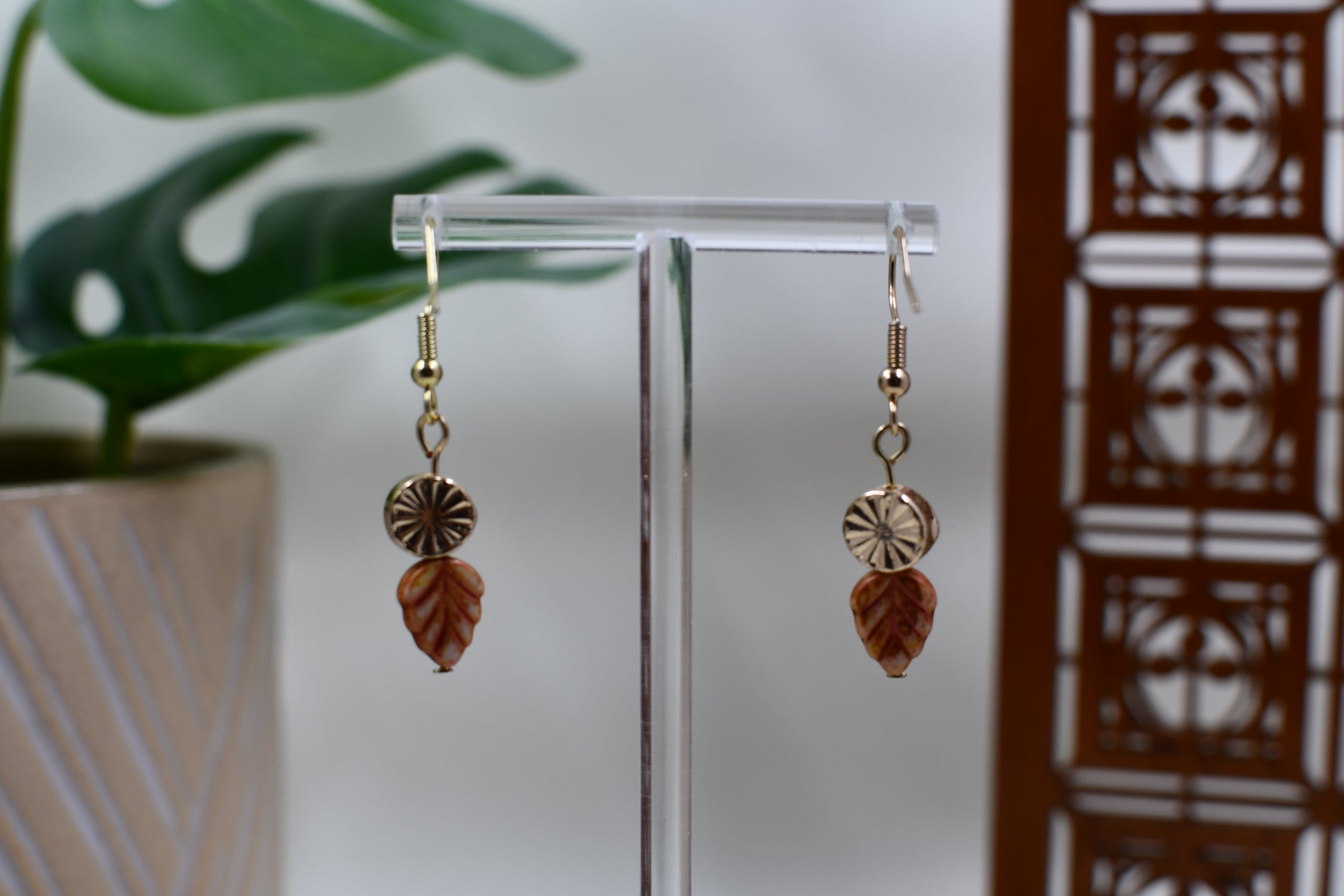 Autumn Orange Leaf and Gold Medallion Dangle Earrings