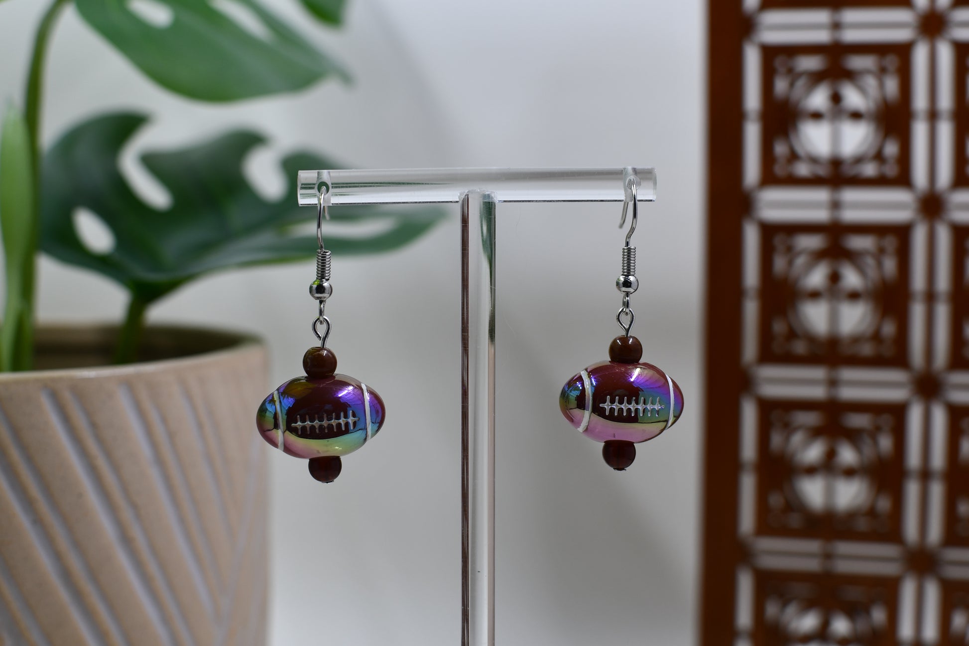 Add a playful touch to your outfit with these Brown Iridescent Acrylic Football Dangle Earrings. Lightweight and vibrant, they catch the light with a subtle shimmer, making them perfect for game day or casual wear. Their unique design blends sporty charm with stylish flair, a great way to show off your team spirit while staying effortlessly chic.