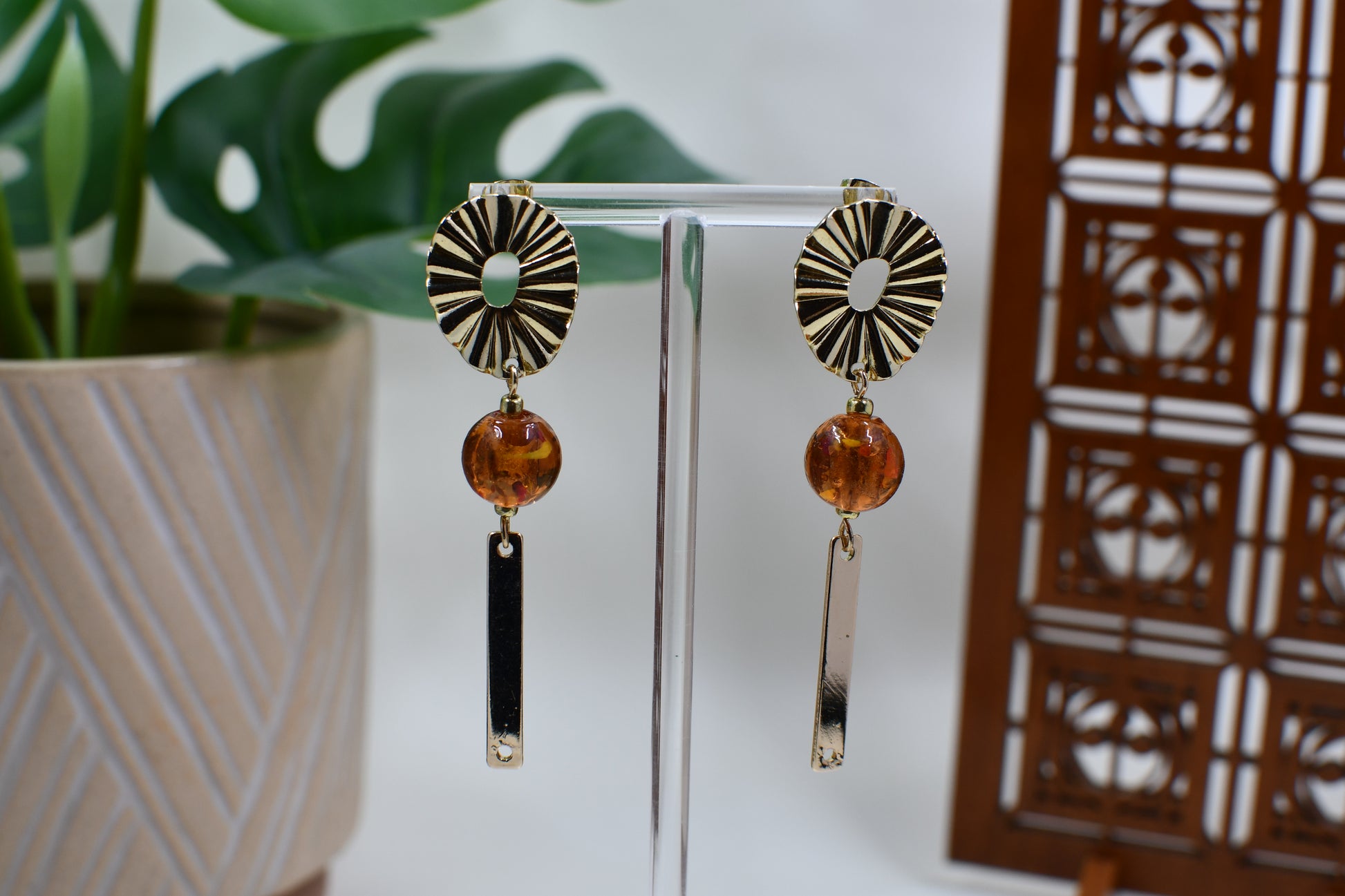 These Gold Ruffle and Bar Earrings feature delicate orange crackled glass beads that gently catch the light. Their drop design adds a subtle touch of warmth and charm, perfect for cozying up any outfit with a soft, inviting glow. Comfortable and stylish, these earrings brighten your day with every wear.
